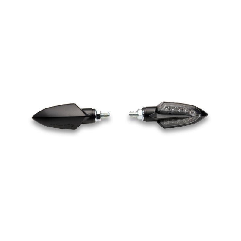 Stylish flashers to replace the standard flashers Flashers for the front and rear are sold separately, require 2 sets for front and rear. Includes blinker speed regulating resistor 9 LEDs per blinker 55cm long wire with shrink sleeve Sold per set of two.