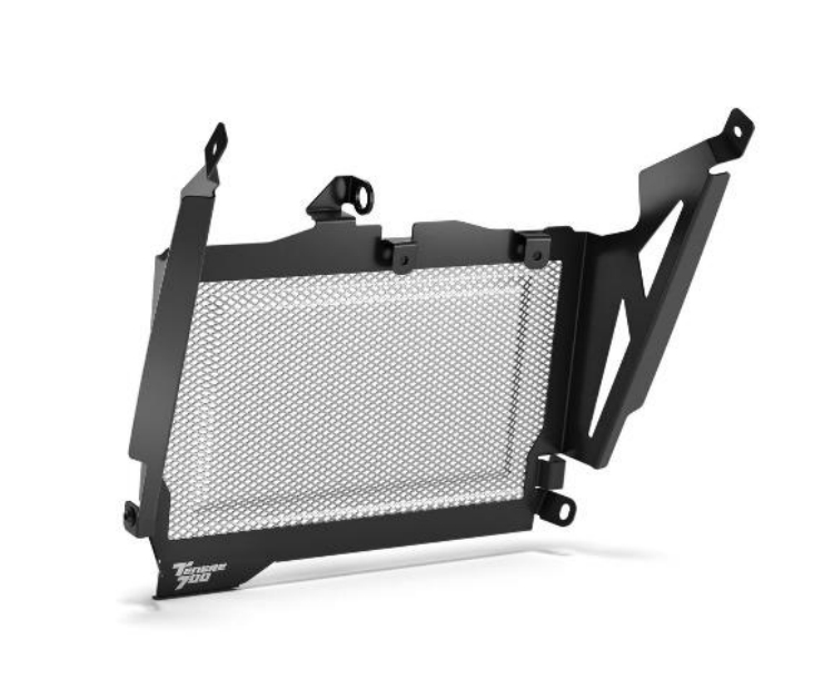 Radiator guard featuring a black anodized frame with stainless mesh. Increased radiator protection against small debris impacts. High quality durable finish. Sturdy, black anodized aluminium frame with large vented side panels. High air flow with strong stainless-steel mesh. Homologated for road usage, included in WVTA.